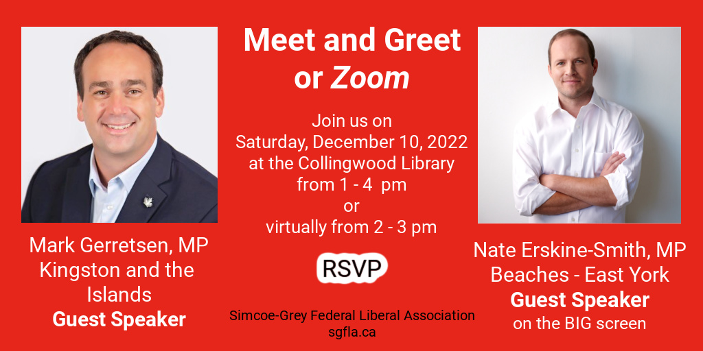 Liberals are invited to join the Board of Directors and 2021 Candidate Bren Munro in welcoming Guest Speakers Mark Gerretsen, MP, PS, Kingston and the Islands to Collingwood. Nate Erskine-Smith, MP, Beaches East York will zoom in.
